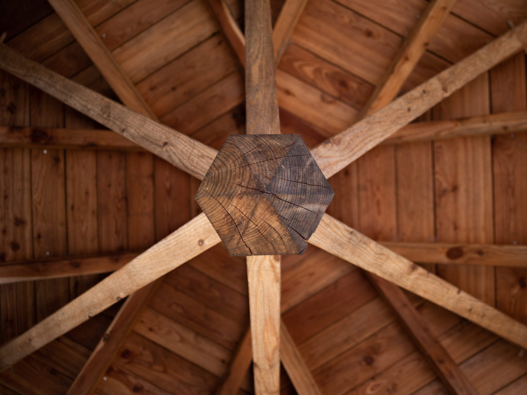 Structure et charpente en mélèze sur poteau central en chêne, couverture en bardeaux de châtaignier fendus et cuivre. Assemblages traditionnels ou métalliques suivant leur exposition aux intempéries.